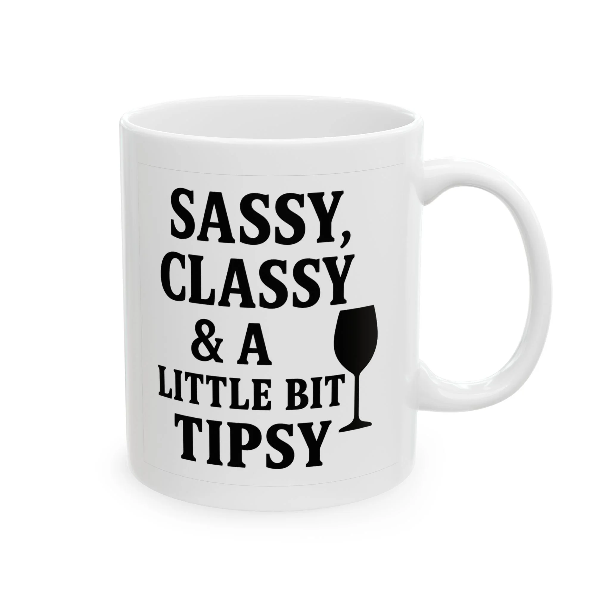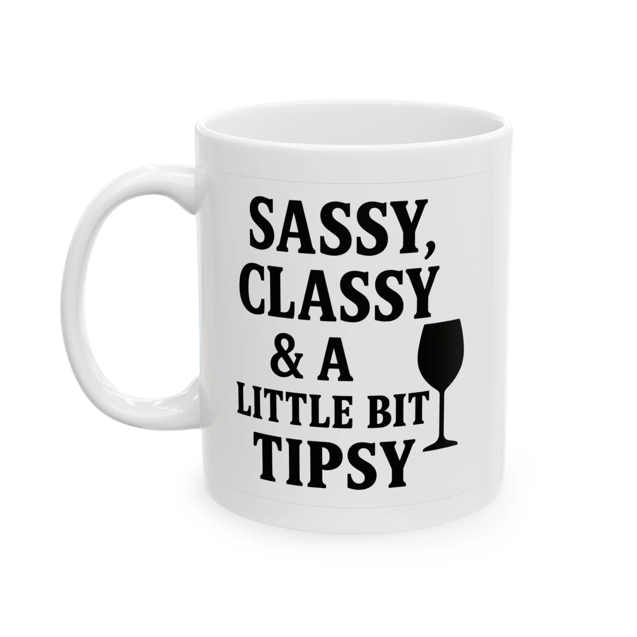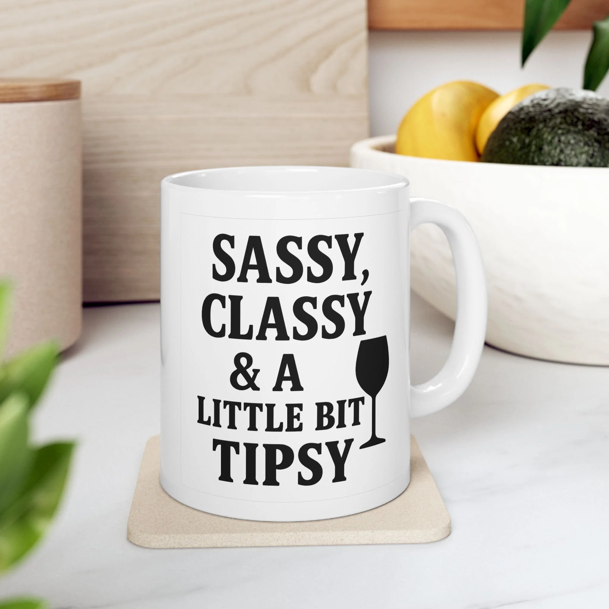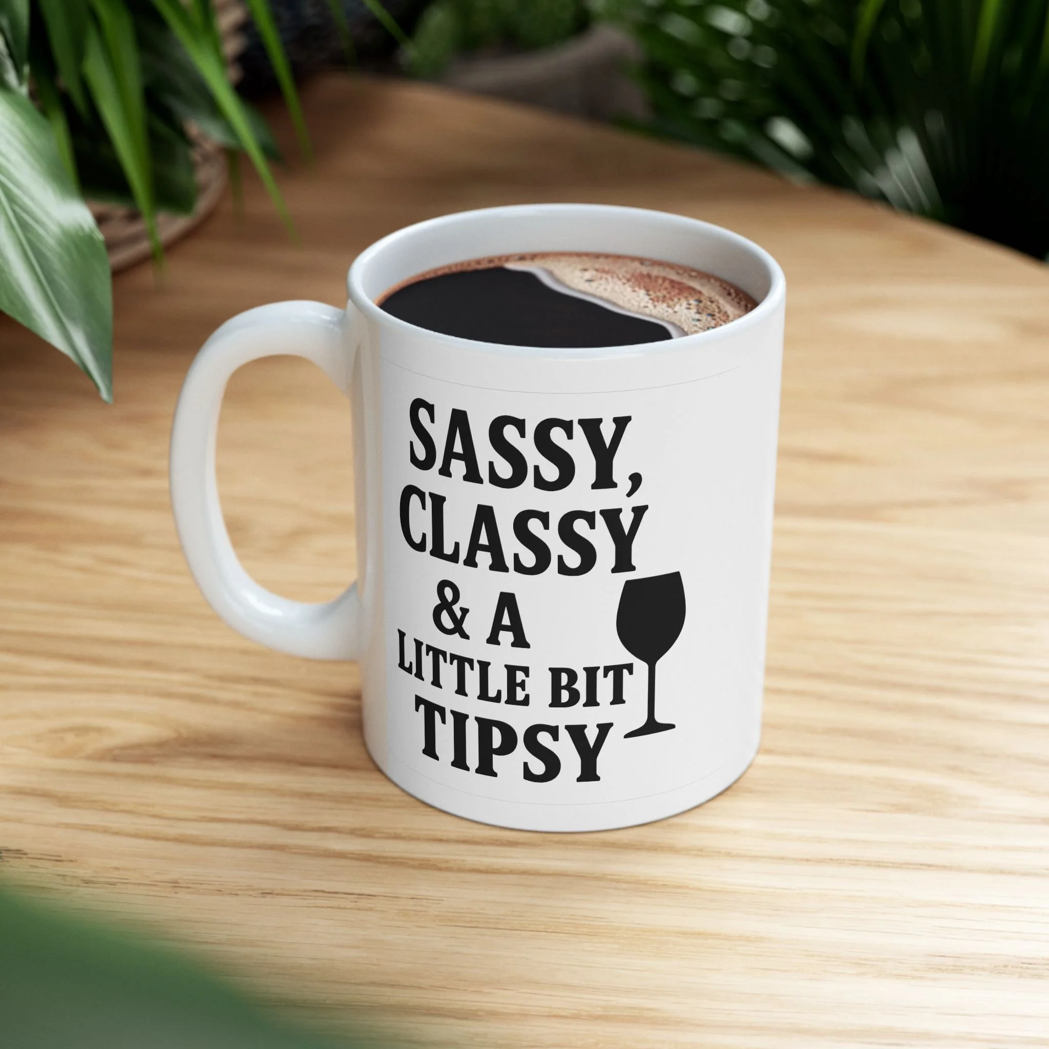 Funny Wine Mug - 11oz, 15oz Ceramic Mug - Sassy Classy & A Little Bit Tipsy - Wine Lover Gift, Girls Night Humor Coffee Cup